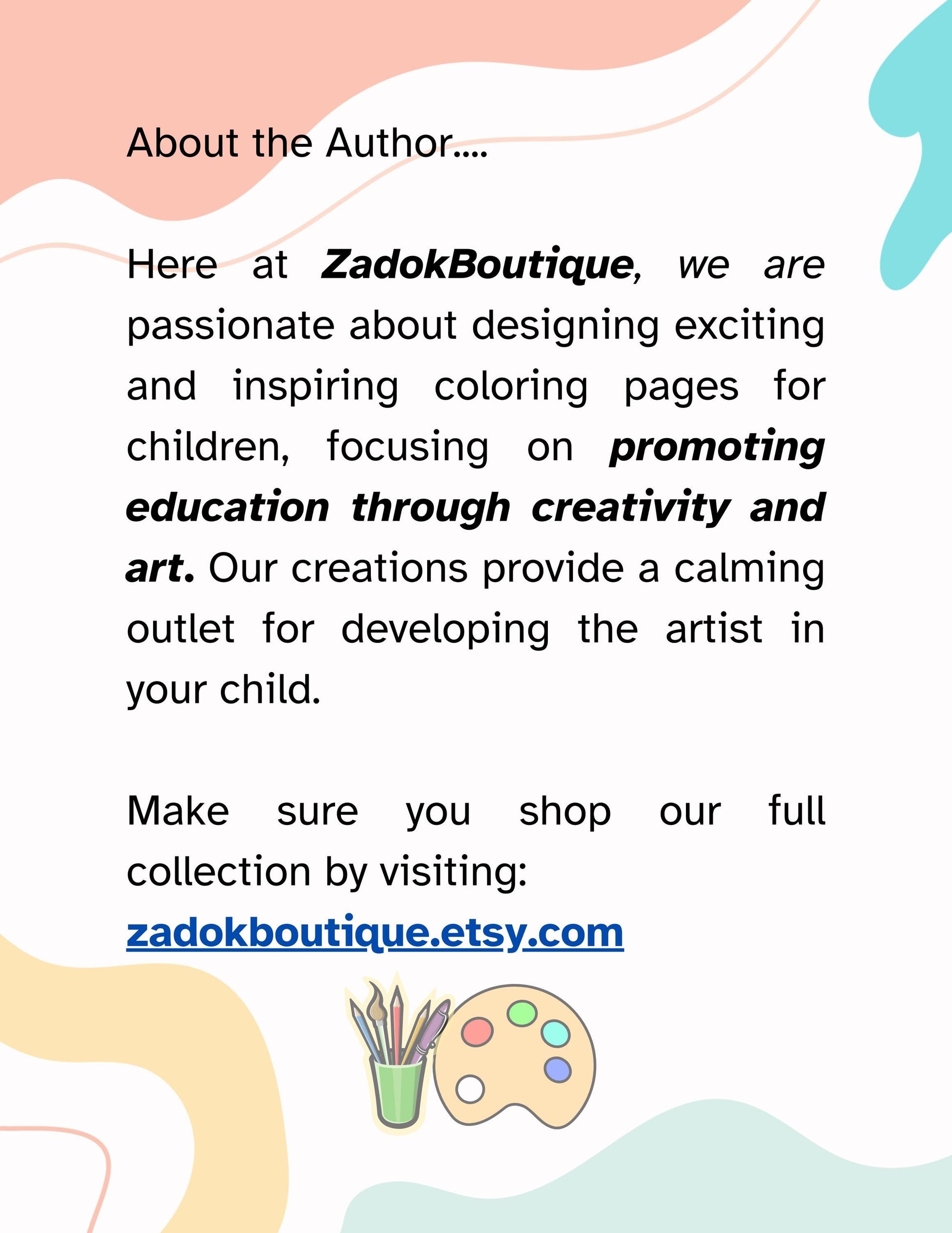 A-Z Alphabet coloring pages for Children - In this coloring book you get 26 coloring pages for A-Z of the alphabet. Zadokboutique is passionate about designing exciting and inspiring coloring pages for children, focusing on promoting education through creativity and art, while providing therapy through art as well as helping to develop the artist in your child.