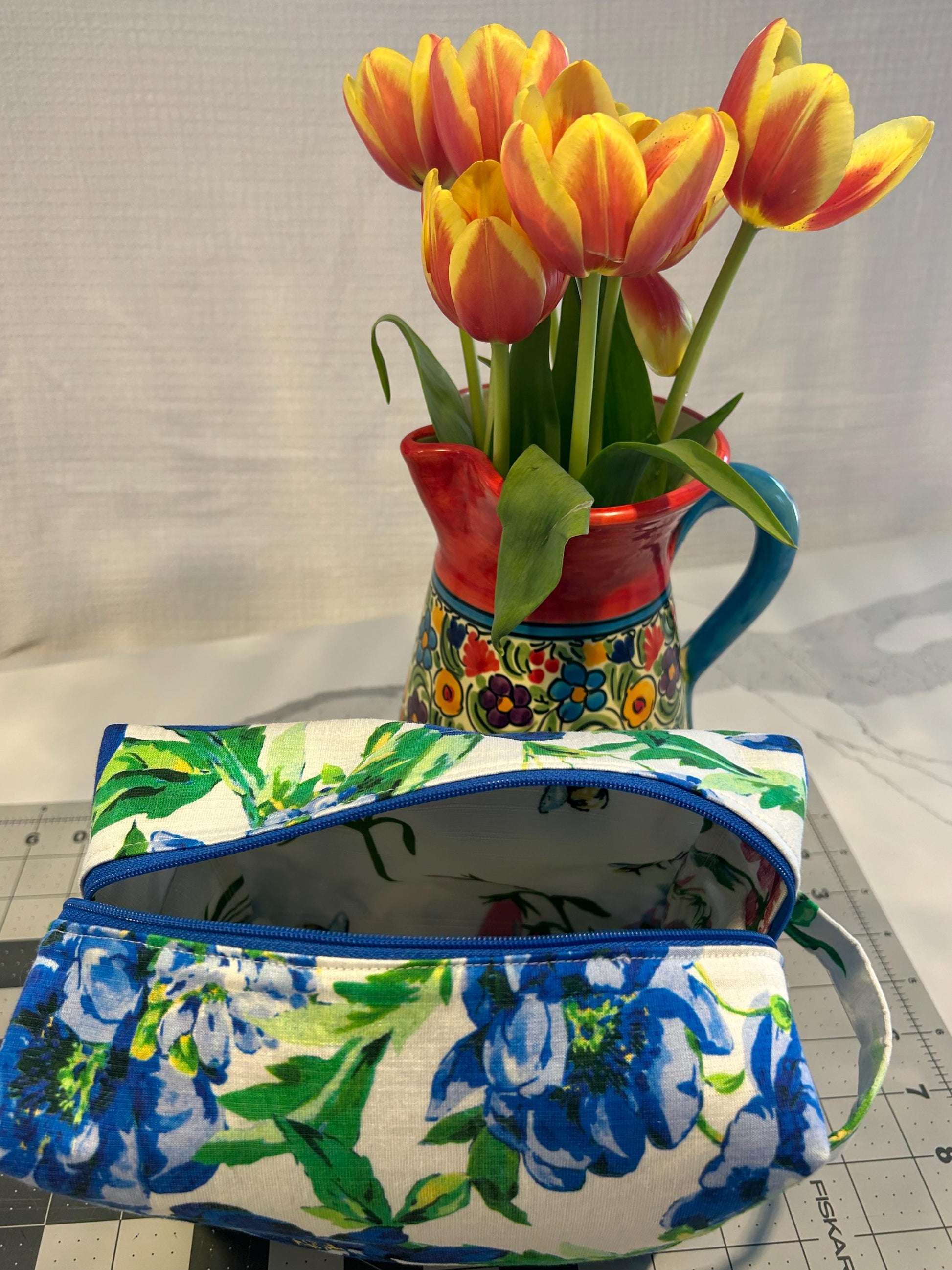 Floral Zipper Pouch: Blue & White Makeup Bag, Handmade in Canada