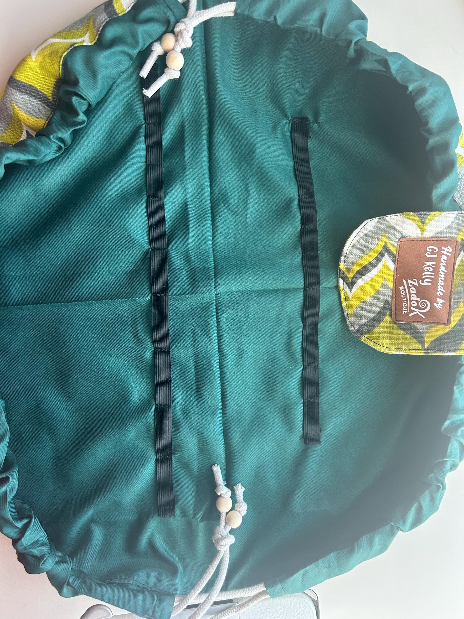 Drawstring Circular Makeup Bag | Cinch Up, Open-Flat Design | Handmade Cosmetic Organizer | Jonathan Adler design - Green-Gray-Yellow fabric