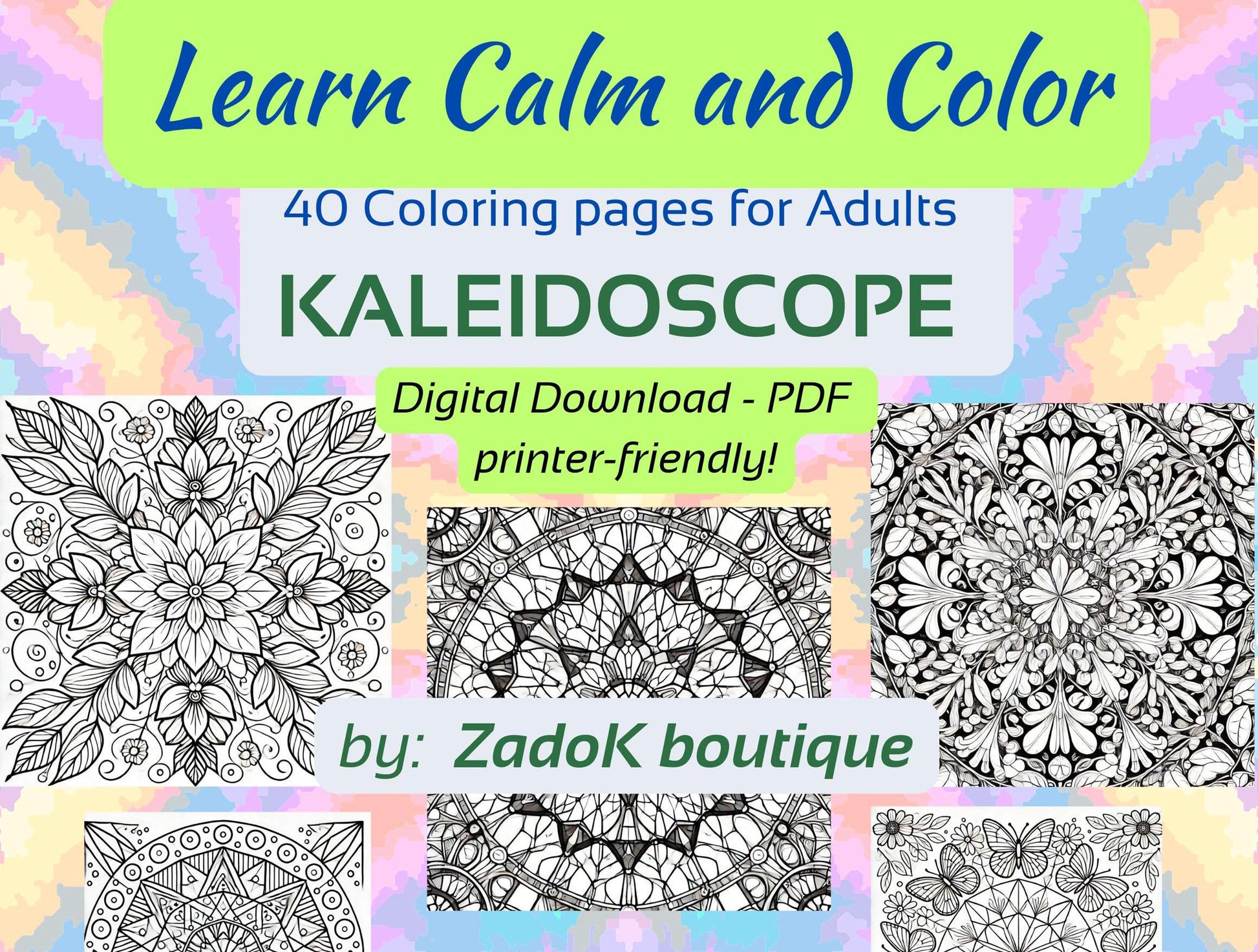 Learn Calm and Color - 40 Coloring Pages of KALEIDOSCOPE designs for Adults - Therapy through Art - to help relieve stress as you enjoy the beautiful images. These are printable files so you can color over and over again, with crayons, markers or any other type of coloring you desire to do.